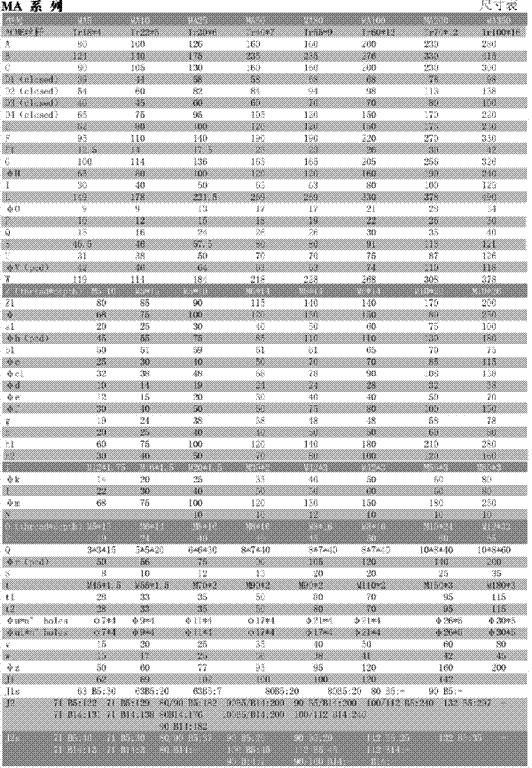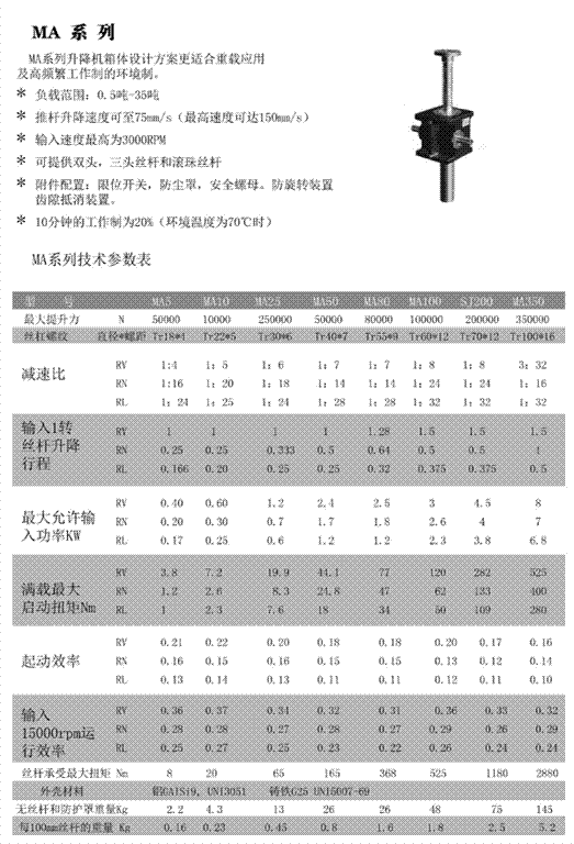 SJ螺旋升降機先進的設計,緊湊的鋁齒輪箱體,與 MA系列有更低的價格額定負載: 0.5噸 - 20噸 推桿升降速度可至30mm/s 最高輸入轉速:1500rpm 工作制:20%(10分鐘運行2分鐘)可選擇雙頭,三頭絲杠配套,參數咨詢我公司附件:齒隙抵消裝置,防轉轉置,安全螺母,防塵罩,磁感應限位開關 MA系列普通齒螺旋升降機 更適合重載應用:重負荷,高頻繁工作制 額定負載: 0.5噸 -35噸 推桿升降速度可至75mm/s 最高輸入轉速: 3000rpm 工作制:30%(10分鐘運行3分鐘)