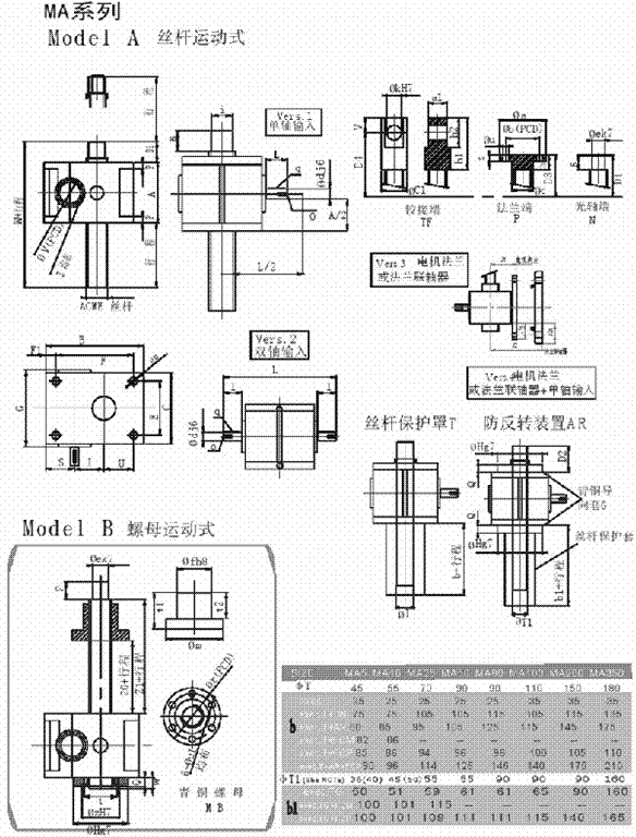 MA系列普通齒螺旋升降機 更適合重載應用:重負荷,高頻繁工作制 額定負載: 0.5噸 -35噸 推桿升降速度可至75mm/s 最高輸入轉速: 3000rpm 工作制:30%(10分鐘運行3分鐘) 可選擇雙頭,三頭絲杠配套,參數咨詢我公司 附件:齒隙抵消裝置,防轉轉置,安全螺母,防塵罩,磁感應限位開關